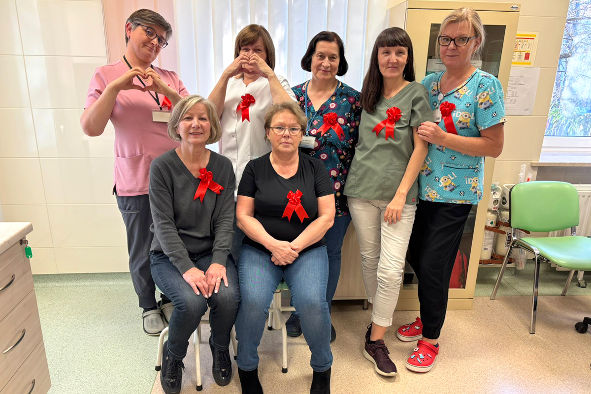 Pracownicy przychodni przy ulicy Klaudyny ubrani na czerwono.