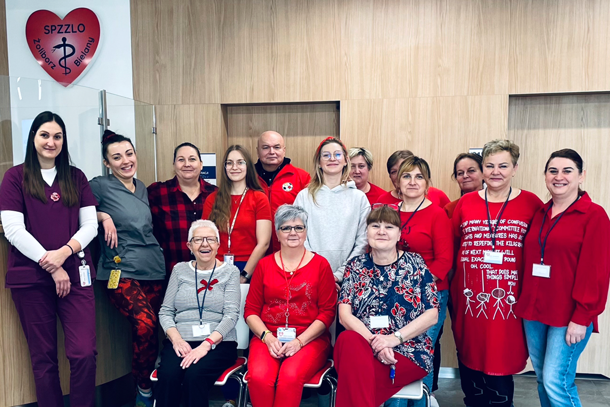Pracownicy przychodni przy ulicy Sieciechowskiej ubrani na czerwono.